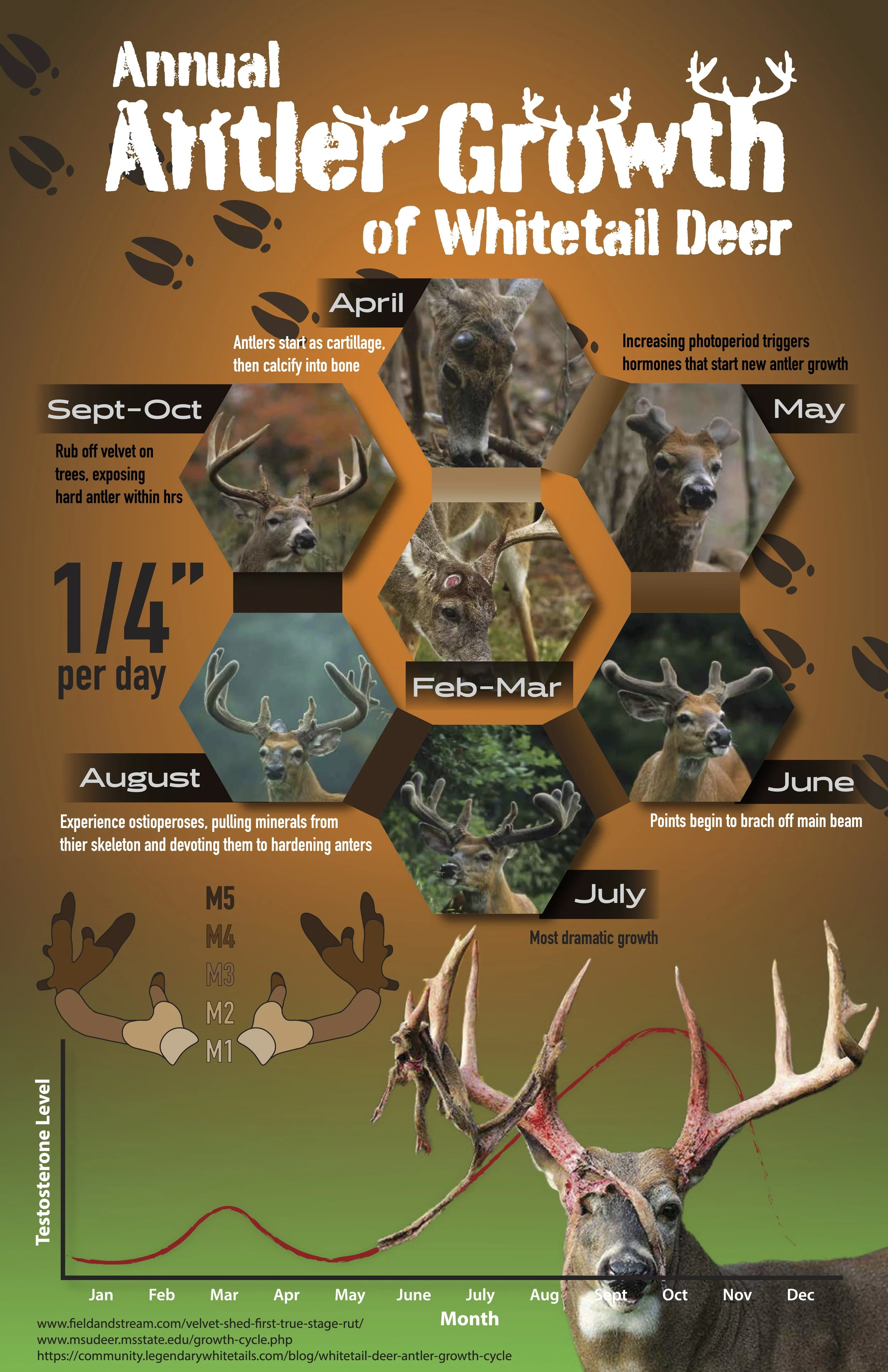 The design features two graphs, with detailed graphics showing the progression from velvet-covered antlers to fully mature racks. Key stages such as velvet shedding, hardening, and regrowth are highlighted for easy understanding. The use of color coding enhances readability, providing an informative and engaging way to learn about the process of antler development.
